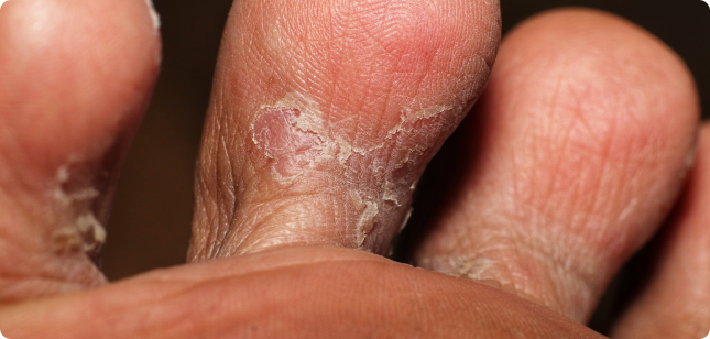 Athletes foot is a fungal infection of the skin. It usually presents as scaling, flaking, itching, redness, blisters or cracking of the soles, heels or between the toes. Infections of the foot can also cause unpleasant odors.